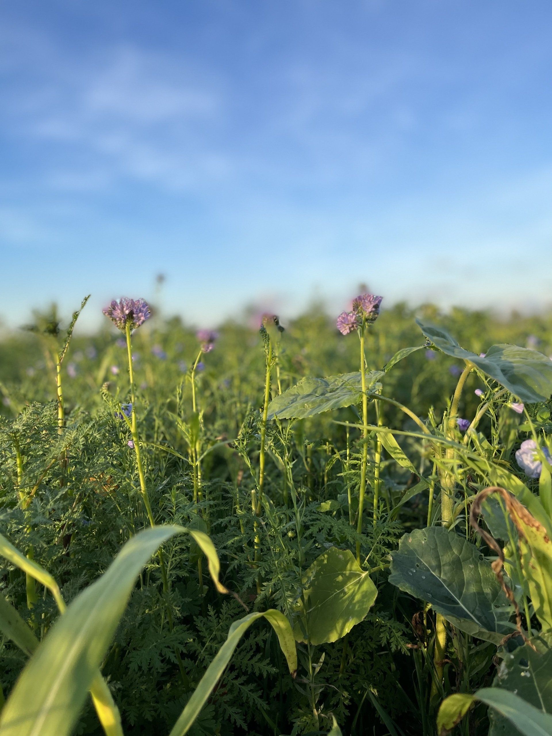 Trotz eines sehr trockenen Startes im Sommer für unsere Zwischenfrucht hat sich diese noch sehr gut entwickelt. Dazu trägt vor allem ein sehr warmer Oktober bei. Der diesjährige Oktober ist einer der wärmsten seit der Wetteraufzeichnungen... Wir haben dieses Jahr wieder Mischungen von Farm2Farm ausprobiert. Diese sind besonders vielfältig und versuchen den Boden auf verschiedenen Ebenen zu beschatten und durch viele artenreiche Pflanzen den Boden zu durchwurzeln. Des Weiteren sammelt die Zwischenfrucht Stickstoff für die Folgekultur, in unserem Beispiel wird die nächste Kultur hier Silomais und Zuckerrüben. Zusätzlich schützt die Zwischenfrucht den Boden vor Wind -und Wassererosion. Wir haben uns dieses Jahr für eine abfrierende Mischung, sowie eine winterharte Mischung entschieden. Die winterharte Mischung bedeckt den Boden bis zum Frühjahr. Insgesamt muss man sagen, sind wir trotz der Trockenheit sehr zufrieden mit unseren Beständen und werden weiterhin in Zukunft auf artenreiche Mischungen setzen, um auch den Insekten und Bodenlebewesen eine gute Grundlage zu schaffen.